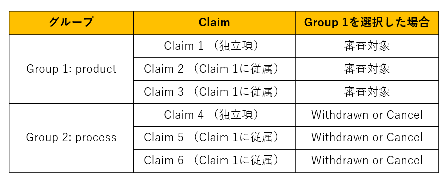 選択しなかったグループのクレームは、取り下げ(withdrawn)または取り消し(cancel)となります。取り下げたクレームは、一定の要件を満たしていれば再結合(rejoinder)されることがあります。再結合されるクレームの関係としては、例えば[プロダクトクレーム]−[その全ての限定事項を含むプロセスクレーム]が挙げられます(MPEP §806.05(f))。