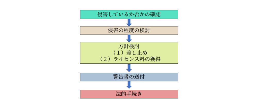 特許権が侵害されていることがわかった場合、例えば、以下のフローで検討を行います。